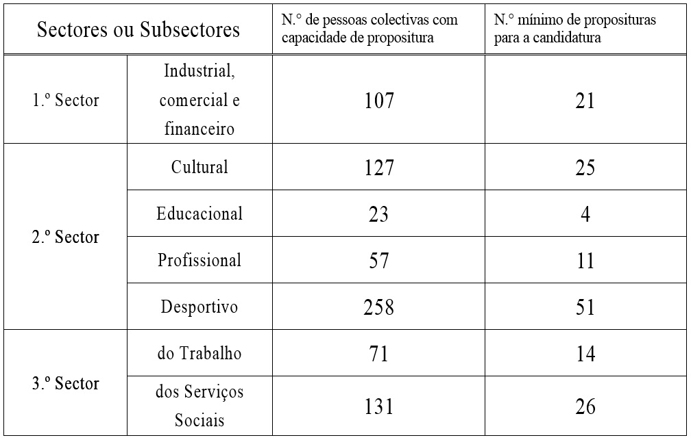 O caderno de recenseamento exposto publicamente em Janeiro de 2019 é o último a ser exposto antes da publicação da data das eleições dos membros da Comissão Eleitoral. O número das pessoas colectivas de sectores ou subsectores, com capacidade de propositura, inscritas no caderno de recenseamento e o número mínimo de proposituras, ou seja, 20% do número total das respectivas pessoas colectivas arredondado para o respectivo candidato poder participar nas eleições são indicados no seguinte quadro: